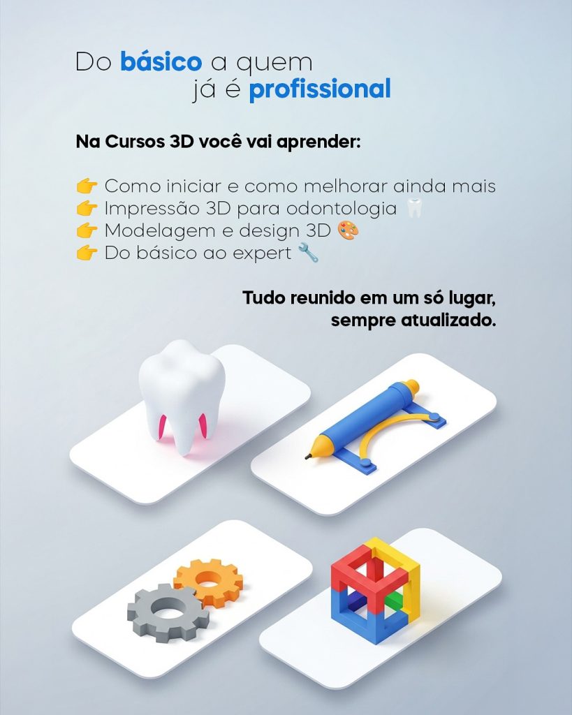 A Cursos 3D oferecerá um catálogo de cursos práticos e sempre atualizados, cobrindo desde os fundamentos essenciais até as aplicações mais específicas. Você poderá mergulhar em temas como modelagem 3D para criar seus próprios projetos, explorar a impressão 3D aplicada à odontologia para inovar em sua clínica, ou desvendar os segredos das técnicas avançadas que levarão seus projetos para outro patamar de qualidade e complexidade.