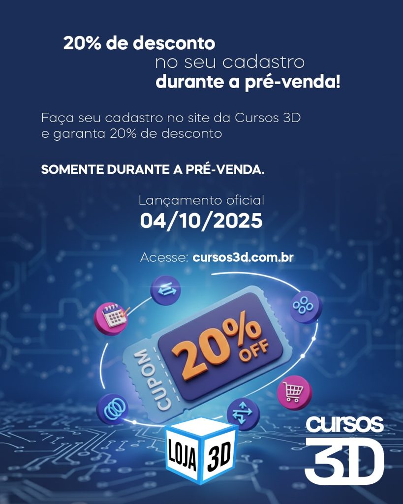 O lançamento oficial está marcado para o dia 04 de outubro de 2025, e temos uma oferta imperdível. Cadastrando já na Cursos 3D somente durante a pré-venda, você recebe um cupom de 20% de desconto!